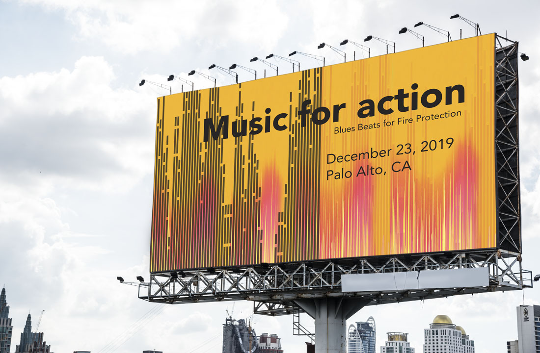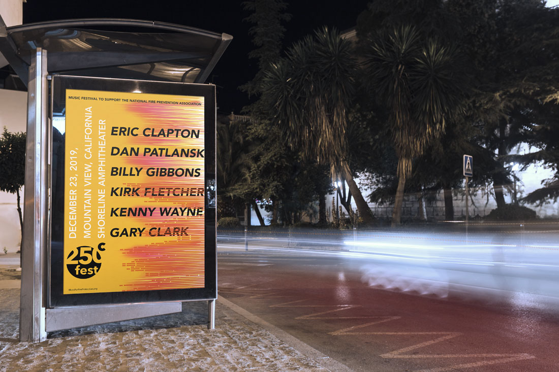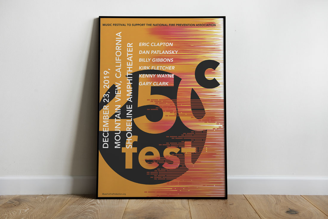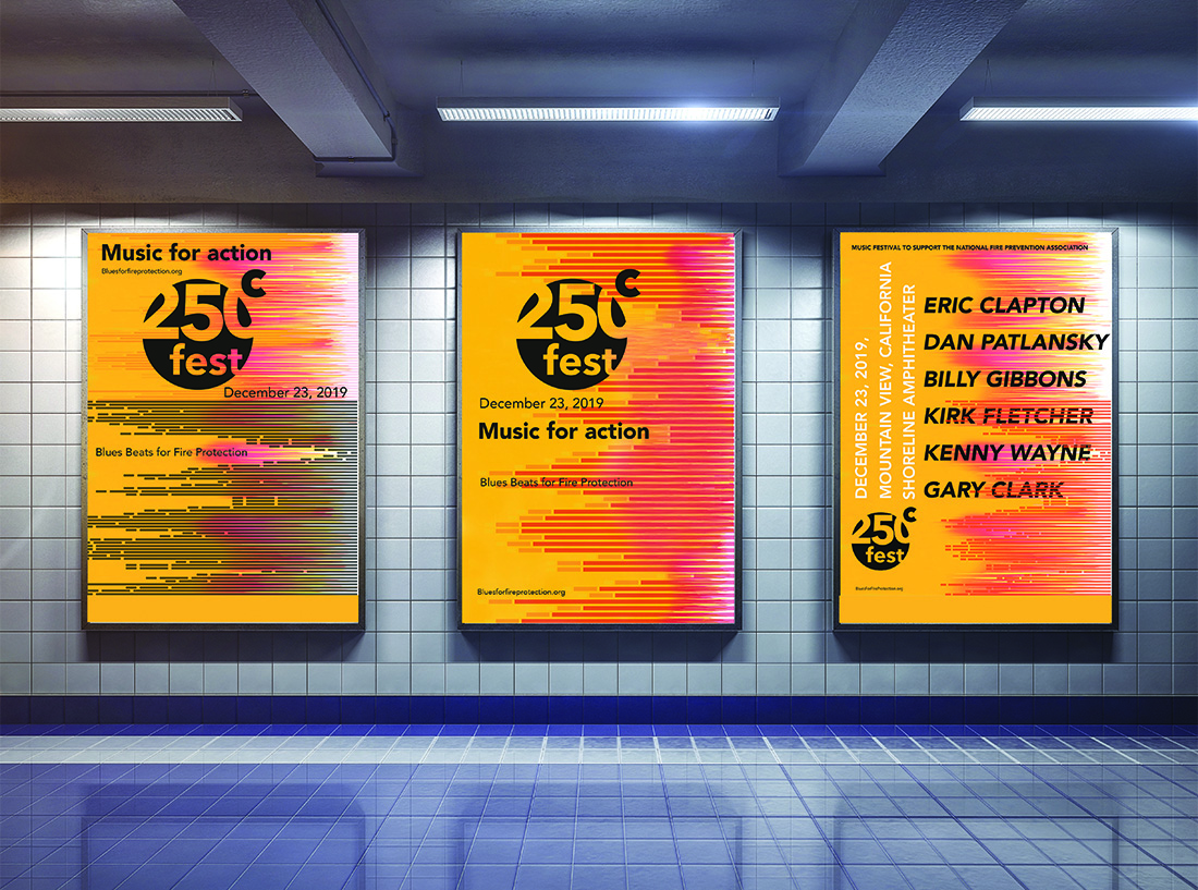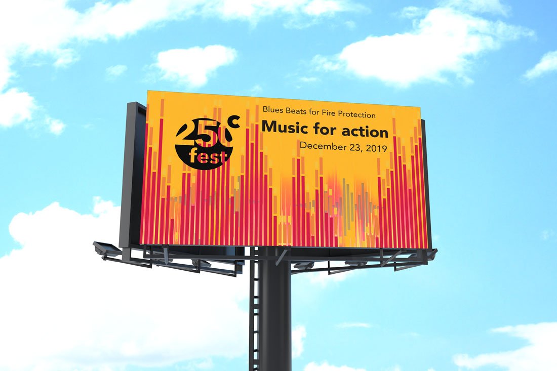 People will go to this Musical Festival to support the environment (Global Warming). 250C Musical Festival is dedicated to raising funds for wildfire protection and relief. The design concept was to make a parallel between a forest in flames and musical waves.